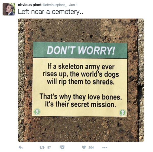 贴在墓地旁边的:“别担心!如果骷髅军团崛起了,地球上的狗就会把它们撕碎。你以为狗为什么爱骨头?这是它们的秘密使命嘛。”