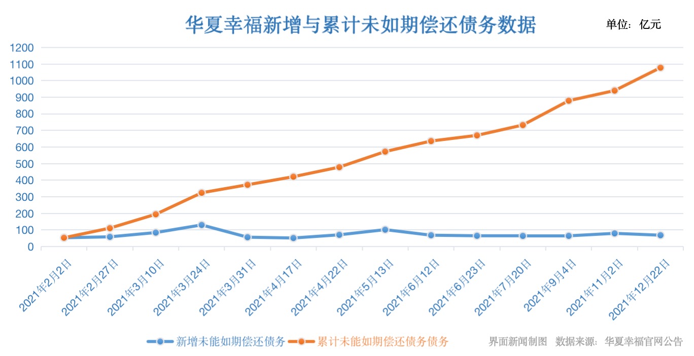 自2021年2月1日华夏幸福官方首次公开承认债务逾期问题后,华夏幸福公司及其下属子公司未如期偿还债务不断攀升。据界面新闻统计,2021年2月1日至2021年12月22日期间,华夏幸福共计公布了14则债务未能偿还公告,累计未能如期偿还债务由2021年2月1日的 52.55亿元逐步增至2021年12月22日的1078.05亿元。