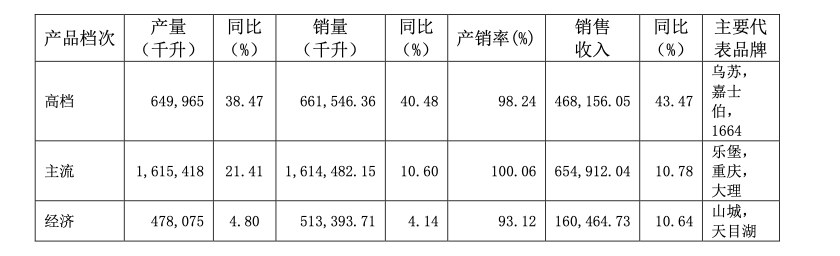 按产品档次划分,消费价格为 10 元以上的高档产品实现销量66.15万千升,同比增长40.48%;消费价格在6- 9元的主流产品实现销量161.45万千升,同比增长10.60%;消费价格在 6 元以下的经济产品实现销量51.34万千升,同比增长4.14%。