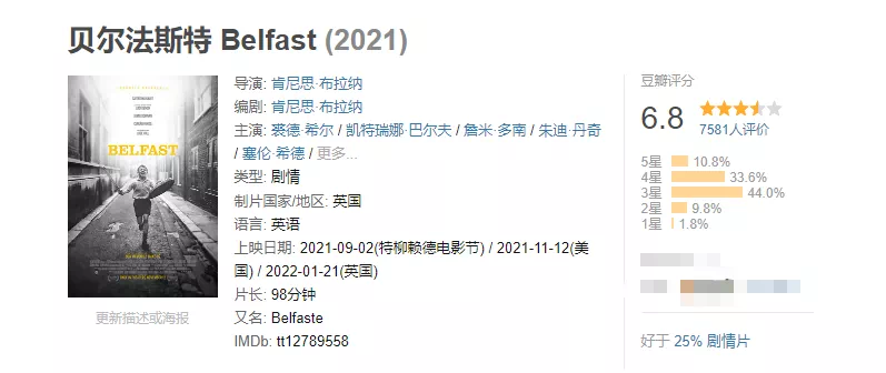 获得7项提名并最终捧回“最佳原创剧本”奖杯的《贝尔法斯特》,豆瓣评分仅有6.8,国内观众似乎对导演肯尼思·布拉纳自传式的书写并不买账,不仅无法共情黑白画面里流动的乡愁,反而对故事充满疑惑:不仅可以升职加薪还附赠一套带花园的大房子,这一大家子人为什么还要犹豫不决?