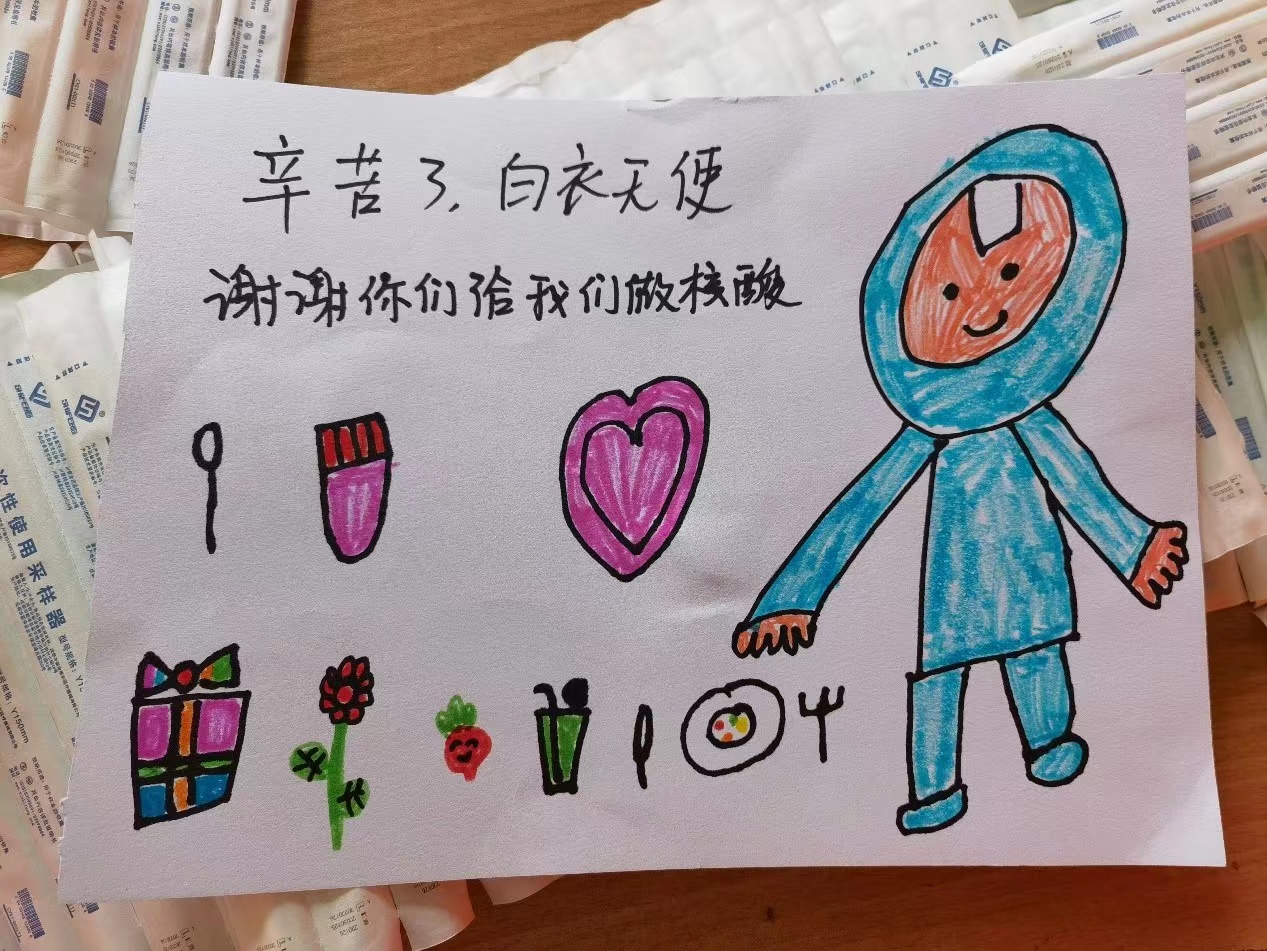 “在核酸采样间隙,我们的医生还能抽空为居民解答一些健康问题,前几日儿外科李会医生还为小区几个小朋友看了舌系带问题,大家都在力所能及地提供帮助。有小朋友为做核酸的医生画了画像,有居民给我们送巧克力,这些都是我们的动力”,史伟明表示。