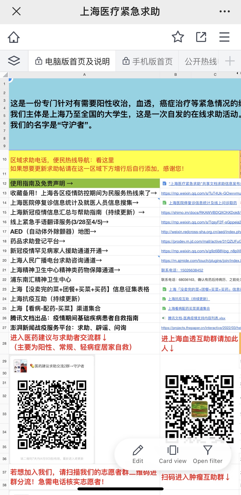 许多关心上海疫情的志愿者也通过网络建立了联系,并开启共同合作。3月29日开始,一份名为“上海医疗紧急求助”的文档在许多人的朋友圈与微信群中传播,这份文档不仅收录了各类疾病的应对指南、求助热线,血透及肿瘤患者的互助群二维码,同时急需就医的市民也可以在表单上填写他们的需求和联系方式。