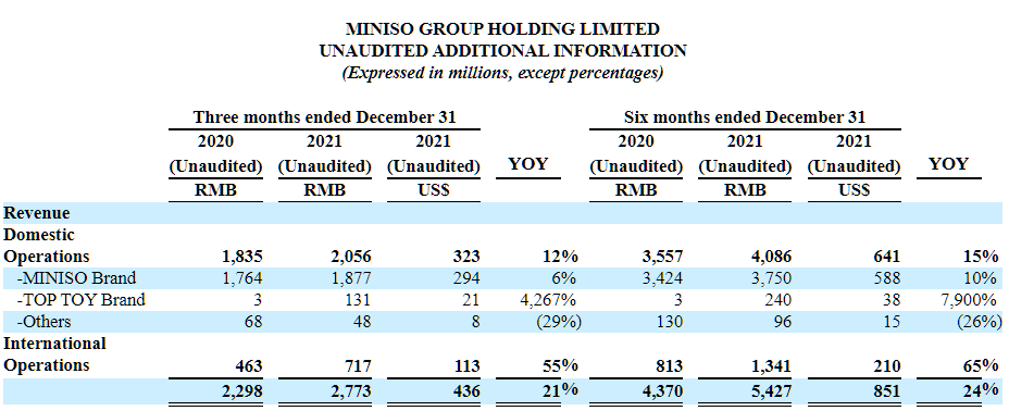 另外,名创优品中国门店的数量从2020年第四季度的2768家增长到2021年底的3168家,门店数量增长比例为14.5%,这一数据也超过了名创优品中国业务的营收。