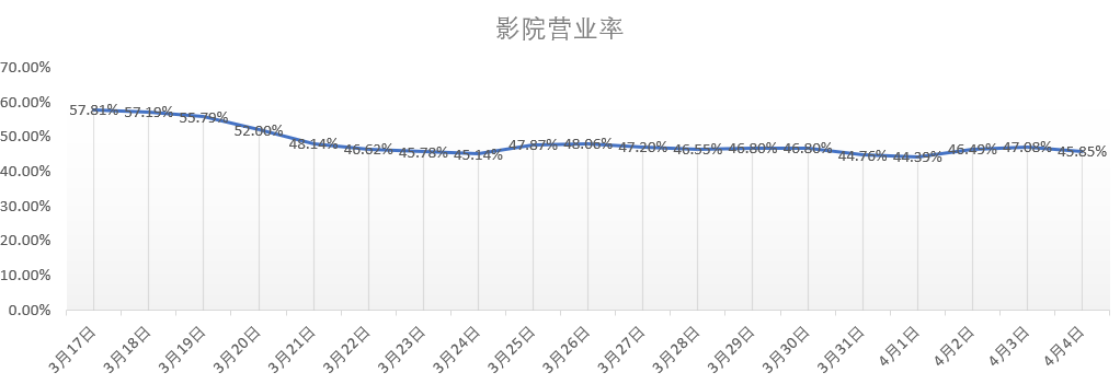 影市降至冰点,一方面是由于影院停工。据猫眼专业版数据,自3月21日至4月4日,全国影院营业率持续低于50%。厦门、无锡、南京等多个城市的影院也在疫情影响之下停工。3月21日至今的14天内有9天大盘票房不足1500万元。即使是4月3日清明节假期首日的总票房也仅有4149.35万元,而去年同日票房为30967.77万元。