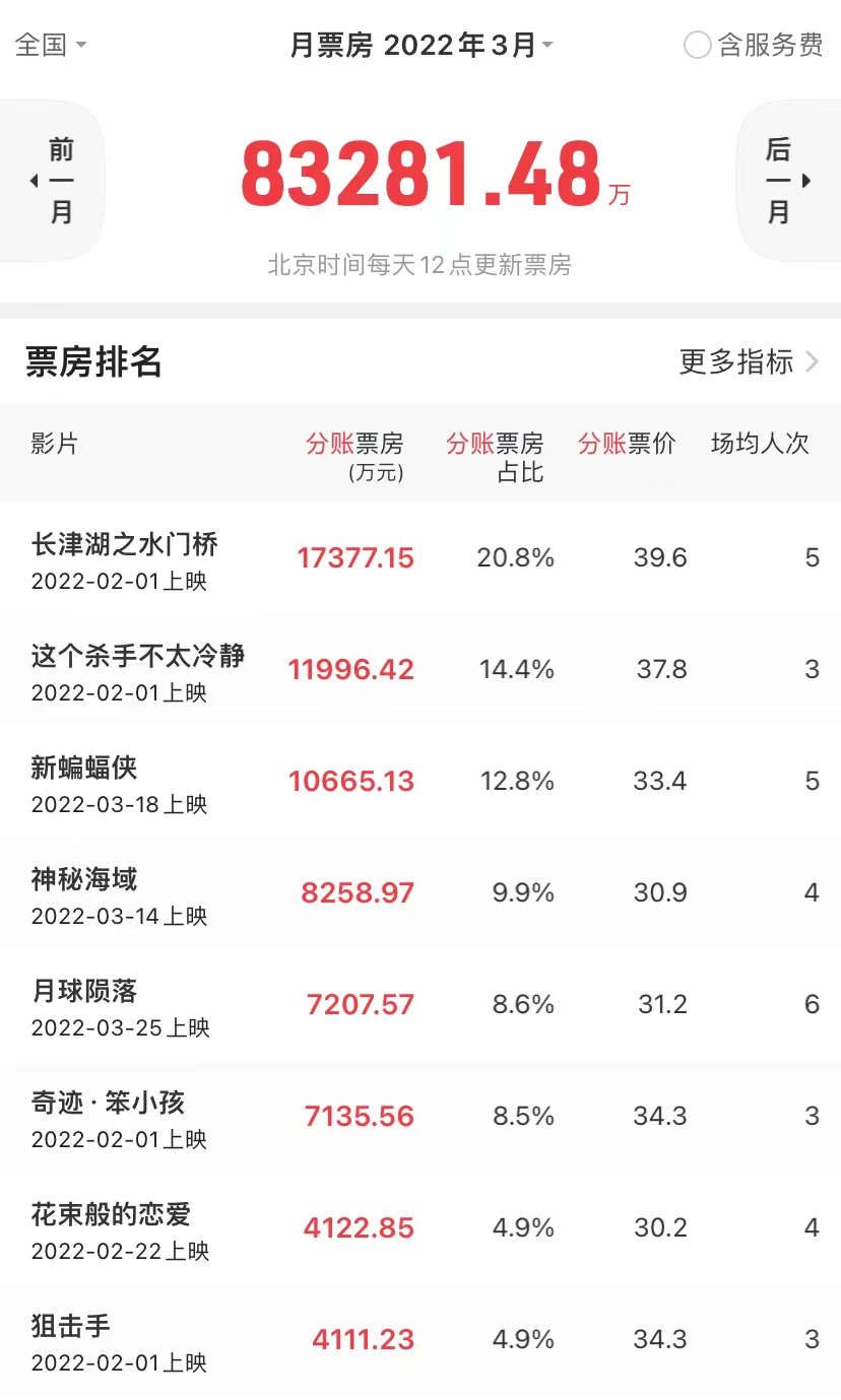 而事实上,3月影院仍然靠一个多月以前上映的电影支撑。据猫眼专业版数据,3月票房冠军是大年初一上映的《长津湖之水门桥》,票房为1.73亿元(不含服务费);第二名的《这个杀手不太冷静》同样上映于大年初一。而第三名的《新蝙蝠侠》仅有1.07亿票房,第四名的《神秘海域》在不含服务费的情况下,票房仅有8258.97万元。