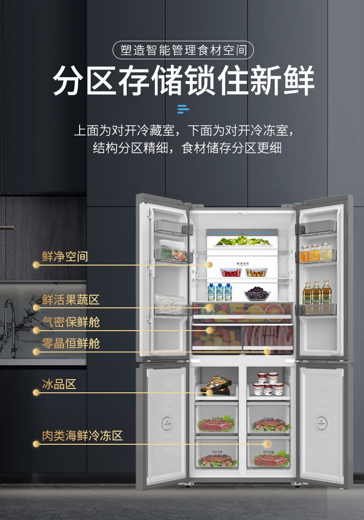 储存海鲜也不必担心滋生异味、污染冰箱环境。这款冰箱的离子洄游净化技术采用Ion migration离子发生器不间断产生±离子,主动灭菌净化消除异味,净化进度实时可见;>99.9%的除菌能力和99%的净化/除异味能力有“证”可依,保持卫生干净,不怕冰箱被鱼腥味占领。
