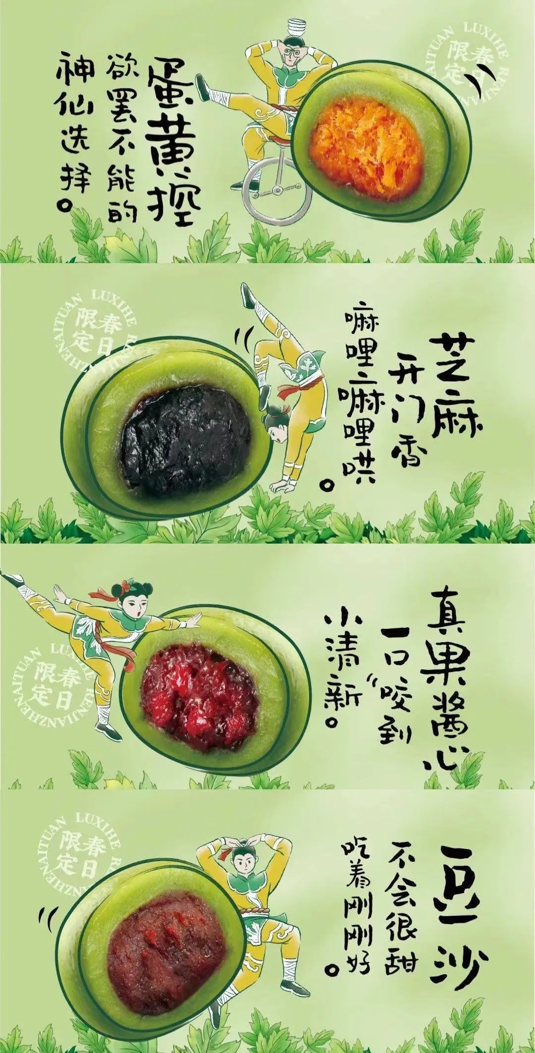 口味之外,如今年轻的消费者也会考虑包装设计、审美等因素,青团已经不单单只是节日糕点,还成为了一种礼品选择,在代表希望的春天,青团作为充满仪式感的节日食品,能够承载人文情怀和美好联想,这对产品的包装设计提出了更高的要求,而消费者也更愿意为这些有文化属性加成的高颜值产品买单。泸溪河今年推出的限定艾团 “人间真艾团”,整体的礼盒主打“杂技”风,画面以四位身怀绝技的杂技团成员为主角,四人成团,呼应“真艾团”概念。知味观的包装也值得一提,将江南水乡风光“搬”进了青团包装中,每款产品的正面都对应一处西湖美景。