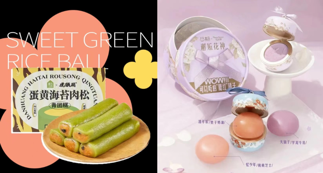 左:盒马 X 虎头局蛋黄海苔肉松青团糕(上海限定),右:盒马 X “花知晓”腮红团子,图片来源:盒马