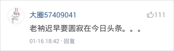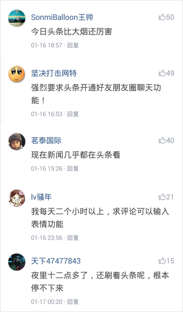 2016年1月15日,二十一世纪商业评论在今日头条发表了一篇标题为《日平均使用长达53分钟,今日头条是怎么做到的?》的文章,上面那句话是网友“大圈57409041”的留言。