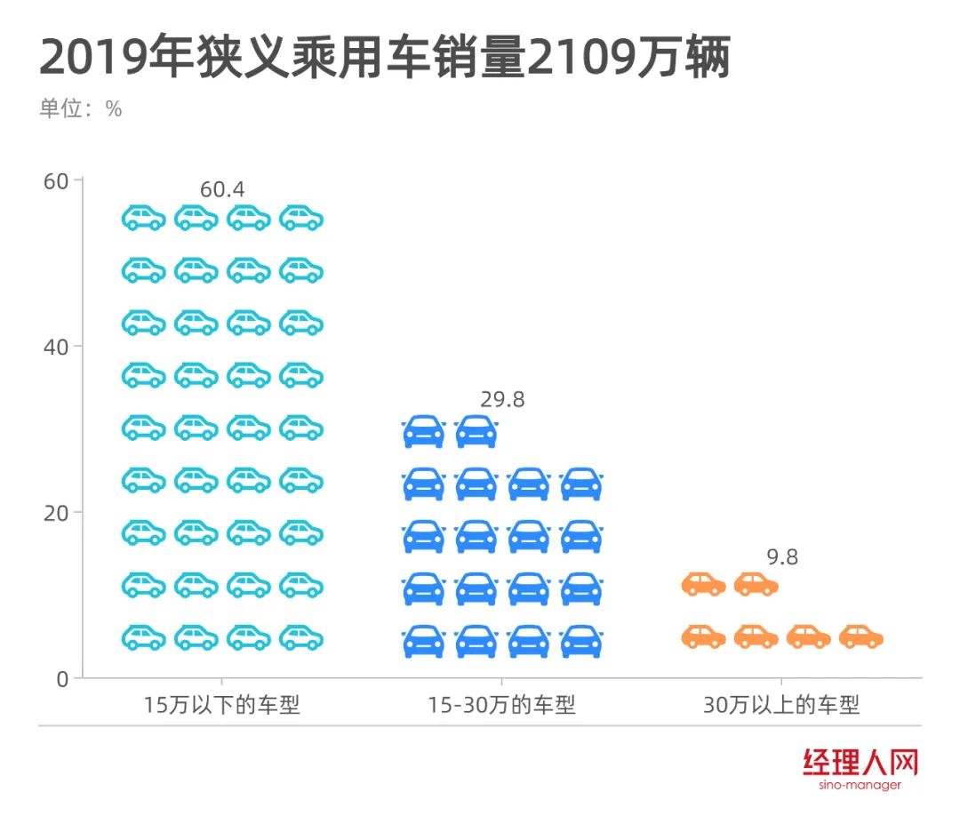 乘联会发布的数据显示,2019年狭义乘用车销量2109万辆,其中15万以下的车型占比高达60.4%。15-30万的车型占比为29.8%,而30万以上的车型仅占9.8%。2020年,豪华品牌的车型在中国只卖出了323.6万辆,在总销量中的占比仅仅16.2%。