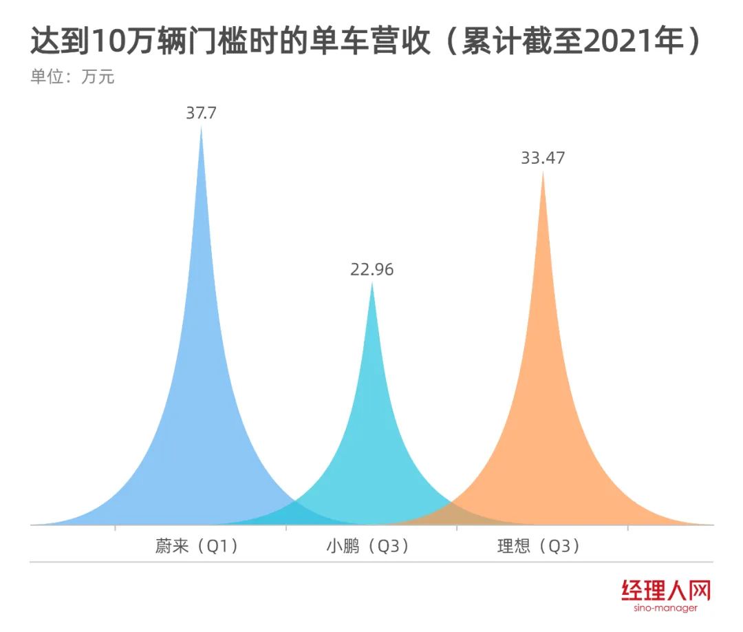 相比之下,蔚来、小鹏、理想达到10万辆门槛时的单车营收,分别为37.7万元(累计截至2021年Q1)、22.96万元(累计截至2021年Q3)和33.74万元(累计截至2021年Q3),分别是哪吒的3.9倍、2.4倍和3.5 倍。