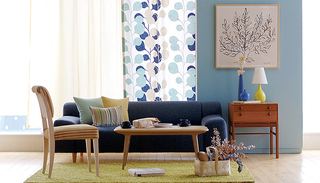 ↑由壁纸、沙发、靠垫组成的不同深浅蓝色组合,主导了整个空间的颜色。