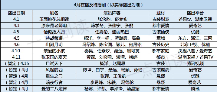 “大剧”环绕的4月,重磅卡司也多。杨洋、冯绍峰、秦昊、黄磊、任素汐……单看这演员片单,4月剧集市场就注定不会太冷清。
