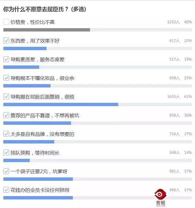 在青眼(微信号:青眼)前段时间发起的一项调查中,有61%的参与者表示,不愿意去屈臣氏的原因是“导购跟在屁股后面推销,很烦”。