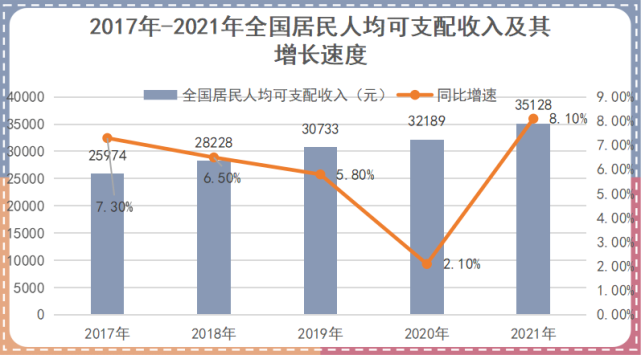 国家统计局数据显示,2017年-2021年全国居民人均可支配收入从25974元增长至35128元。同比增速在2020年出现了2.10%的下滑后,去年增速快速反弹至8.1%。疫情前后的全国居民人均可支配收入同比增速出现“逆势”增长。2021年全国居民人均消费支出24100元,比上年增长13.6%。国内消费复苏势头强劲,消费需求在后疫情时代得到持续释放。