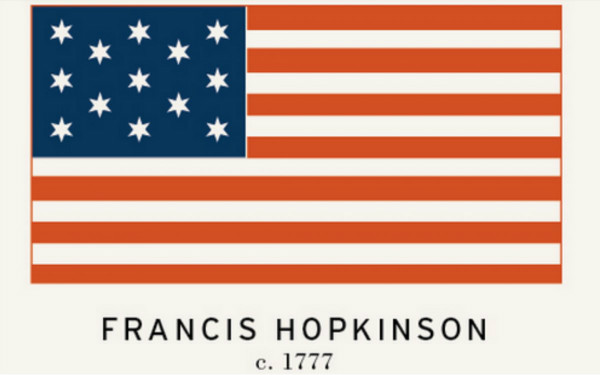 这面旗帜由弗朗西斯·霍普斯金(Francis Hopkinson)设计,并曾与贝奇·罗丝设计的国旗图案争夺“第一款美国国旗”之位。他在1780年写信给国会,声称自己才是首面官方国旗的设计者,但从未收到过任何费用报偿。↓