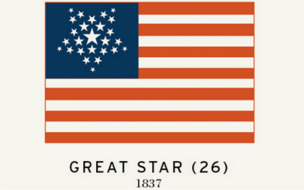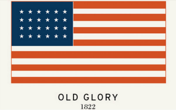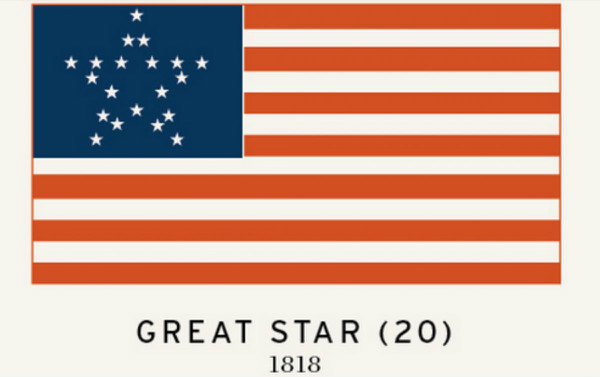 更新一版的旗帜上星星更多了,因为有更多的州加入联邦。国会由此修改了原本只规定了13颗星星的国旗法案。↓