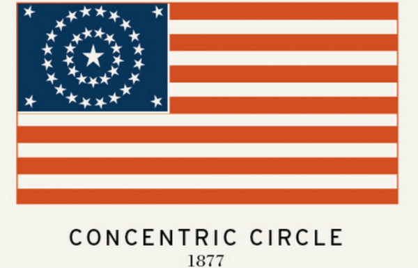 同心圆旗出现过很多不同版本,通常都是有一颗较大的星星在中央,数颗较小的星星围做圆圈向外扩散。下面这款同心圆旗曾出现在1877年的邮票上。↓