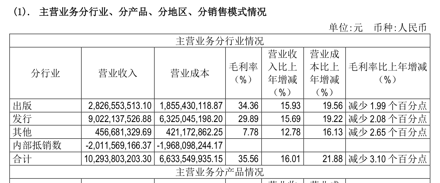 新华文轩业务主要分为出版业务和发行业务,前者营业收入达到28.27亿元,后者90.22亿元,毛利率分别为34.36%和29.89%。营业收入上两者较2020年都有提升,分别增长了15.93%和15.69%,但毛利率较上年度却均有下降,分别下降了1.99个百分点和2.08个百分点。
