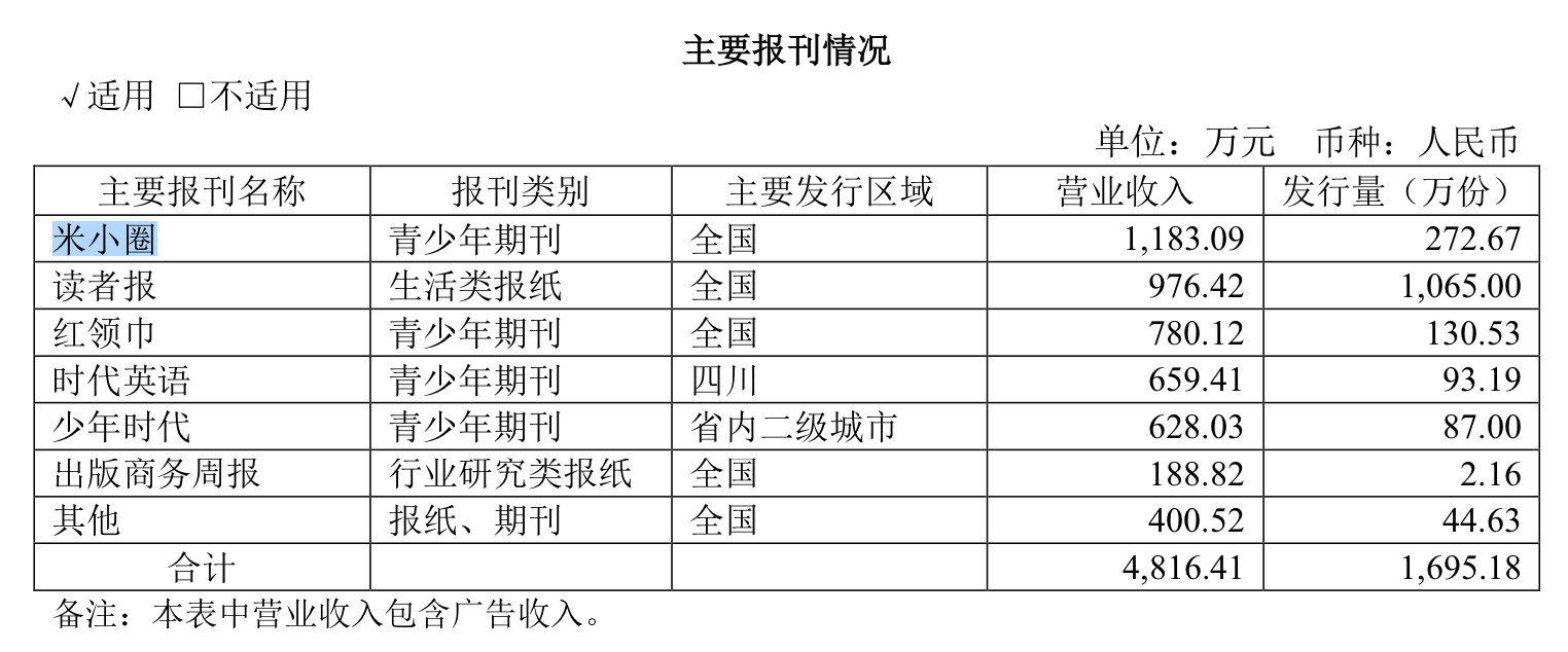 值得注意的是,新华文轩旗下四川少儿出版社拥有爆款IP—米小圈的专有出版权,持续登上开卷少儿图书全国畅销榜,累计销量1.3亿册。2021年发行量272.67万份,收入1183.09万元。据悉,新华文轩旗下拥有13个报刊品牌(2报11刊,含出版社主办报刊),涉及文化、少儿、科普、时尚等类别,受众群体覆盖了从婴幼儿到中老年的各个年龄阶层。