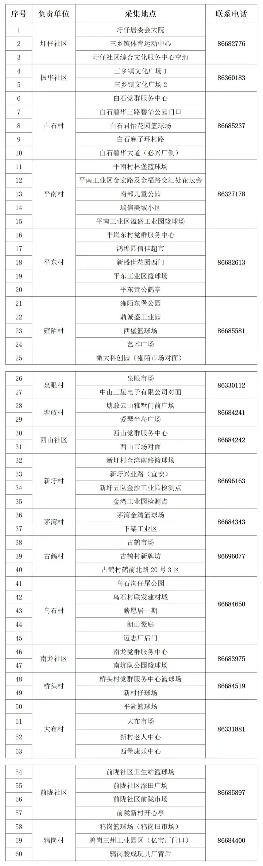三乡镇村(社区)60个核酸采样点