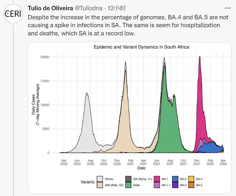 南非流行病应对与创新中心主任奥利维拉(Tulio de Oliveira)在Twitter发文指出,BA.4和BA.5感染目前并没有引起南非的新增确诊、住院患者或者死亡病例增加。
