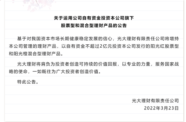 首先,光大理财打响了理财子公司自购“第一枪”。3月23日,光大理财公众号发布“关于运用公司自有资金投资本公司旗下股票型和混合型理财产品的公告”,表示将自购旗下股票型和混合型产品不超过2亿元。