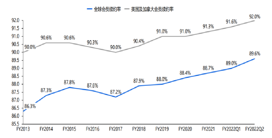从2013年到2021年,全球整体会员续约率从86.3%提升至88.7%,在美国和加拿大的会员续订率在90%的高基数下,依然提升到91.3%。截至2022年二季度,全球续订率继续上升至89.6%,美国和加拿大地区为92.0%。