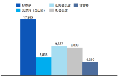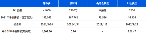 通常来说,超市的SKU数量在4万个左右,购物中心的SKU数量在10万个。Costco以4000个SKU贡献了19亿美元的销售额计算,平均每一个SKU的销售额为4800万美元,以规模优势获取采购的低价。
