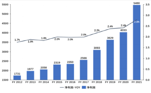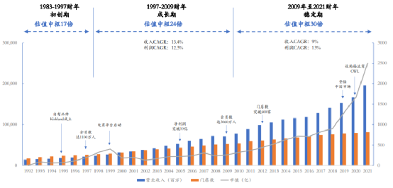 公司作为会员制仓储连锁超市的开创者,1992 -2021 财年期间,公司总营收从141亿美元增长到1959亿美元,复合增长约9.5%。会员费收入从 2.8 亿美元增长至 38.8 亿美元,增长14倍,复合增长率约 9.5%。公司净利润也从 2.42 亿美元增长至 50 亿美元,增长近21倍,复合增长率约 11%。
