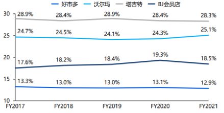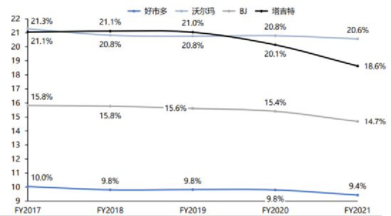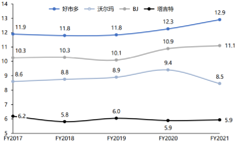 多年来,Costco的费用率基本在10%左右浮动,而对比同行,沃尔玛20.7%,BJ批发俱乐部15%,塔吉特19.8%。