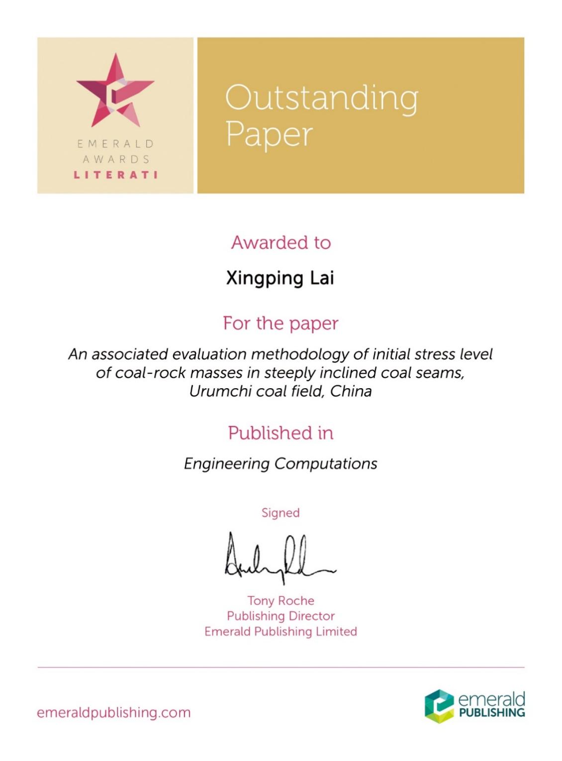 近日,英国爱墨瑞得出版社(Emerald Publishing)公布了2021年Emerald Literati Awards-Outstanding Paper入围名单,西安科技大学矿业工程学科来兴平教授团队发表在《Engineering Computations》的文章《An associated evaluation methodology of initial stress level of coal-rock massesin steeply inclined coal seams,Urumchi coal field,China》获2021年度Emerald Literati Awards-Outstanding Paper奖。