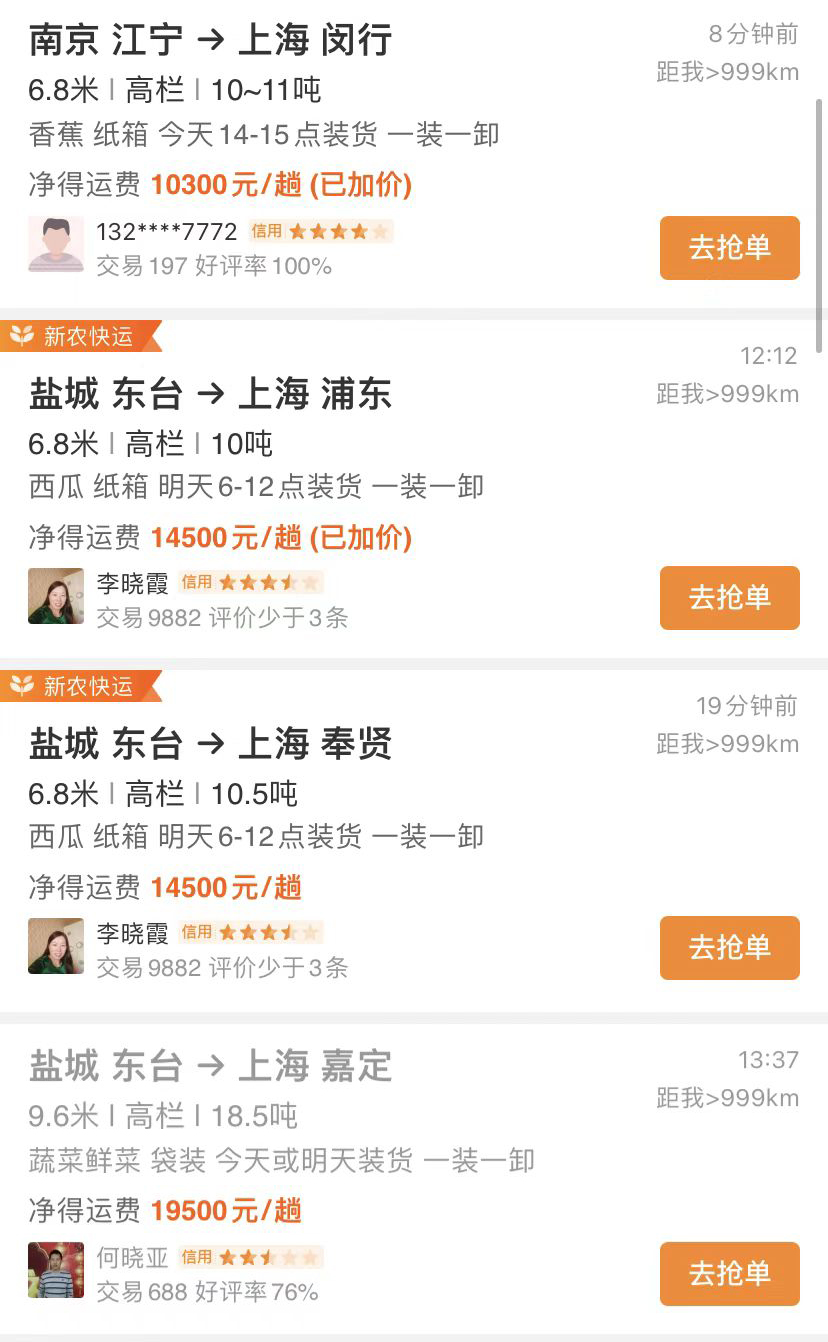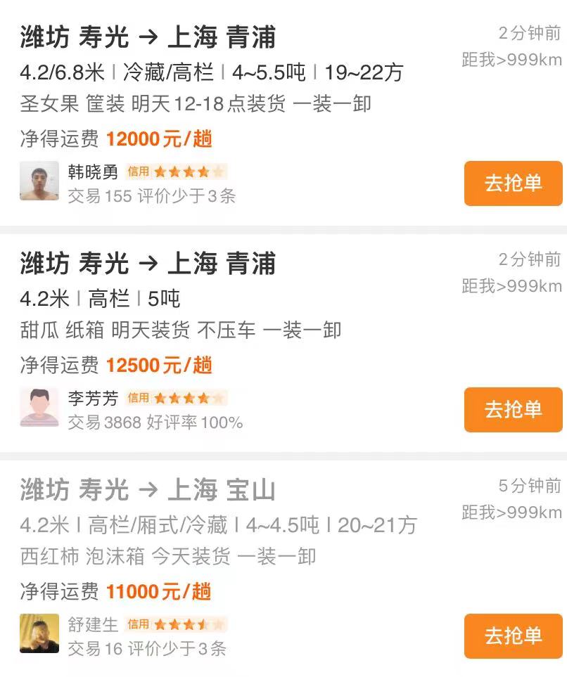 在货运匹配平台运满满上,东台、南京、扬州、连云港等地发往上海的货运订单,最高运价均超过了万元。其中有一单从东台运送18.5吨蔬菜到上海,运费已接近2万元。这些地方距离上海仅有两三百公里,而且果蔬车辆走高速绿色通道还不用缴纳通行费。
