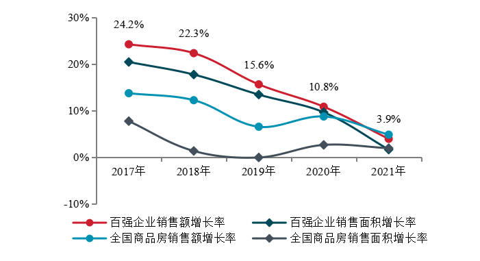 2021年,房地产市场实现了超预期增长,全国商品房销售额为18.2万亿元,销售规模再创历史新高。百强企业顺应市场变化,紧抓热点城市群发展机遇,运用多种营销手段并加大线上及线下营销力度促进回款,实现了销售业绩的增长,但增速首次低于全国。2022年房地产企业面临市场调整的压力,未来稳健经营、行稳致远将是发展的主旋律。