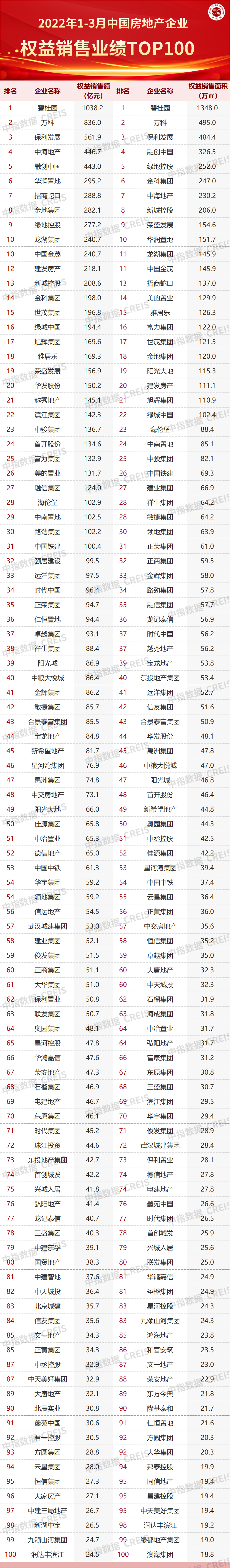 特别声明:房地产企业权益销售数据统计是以2022年1月1日-3月31日期间按股权比例销售的商品房为统计口径,主要依据中指数据CREIS在各地的销售监测数据,并参考当期总体经营情况和推盘去化情况进行分析统计;对于少数没有在监测范围内的城市或项目,由企业提供相关证明文件,经课题组对数据进行严格审核,也纳入统计范围。本报告仅供参考,课题组不对使用报告及其内容所引发的任何直接或间接损失承担责任。