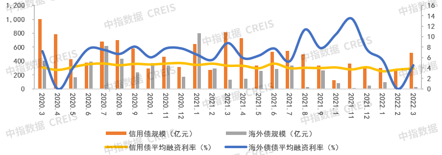2022年3月,房地产企业信用债与海外债发行规模同比均大幅下降。其中,信用债发行规模为514.91亿元,环比上升78.97%,相较于去年3月811.53亿元,同比下降36.55%。3月内地房企海外债发行规模为25.58亿元,相较于去年3月132.53亿元,同比下降80.7%。从融资成本来看,信用债与海外债融资成本有小幅浮动,其中信用债平均利率为3.92%,环比增长0.21个百分点,同比下降0.53个百分点;海外债平均利率为4.54%,环比上升4.54个百分点,同比下降4.26个百分点。