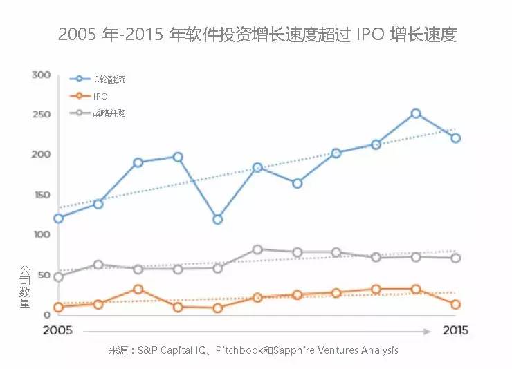 Pitchbook 数据中的信息反映了软件市场上一些公司融资或收购的情况,而这些公司都是收到过 C 轮投资或晚期风险投资的公司。结果证实了我们的直觉:在软件市场,投资的速度远超退出的速度。