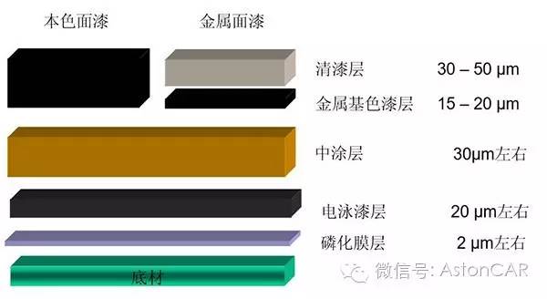 这里我们来扒一扒,汽车到底穿了哪几层衣服:经过处理后的白车身(图中底材)磷化后形成了磷化膜,这是和车身贴得最紧的衣服。磷化膜外边是电泳底漆,穿这层衣服的时候需要特殊的工艺——电泳。电泳后进行中涂,中涂外边就是车身的外套——面漆。面漆分为色漆和清漆,我们看到的车身颜色是色漆。有的车外套太宝贵(豪华车补漆好贵),所以在色漆外边加了一层透明外套——清漆。