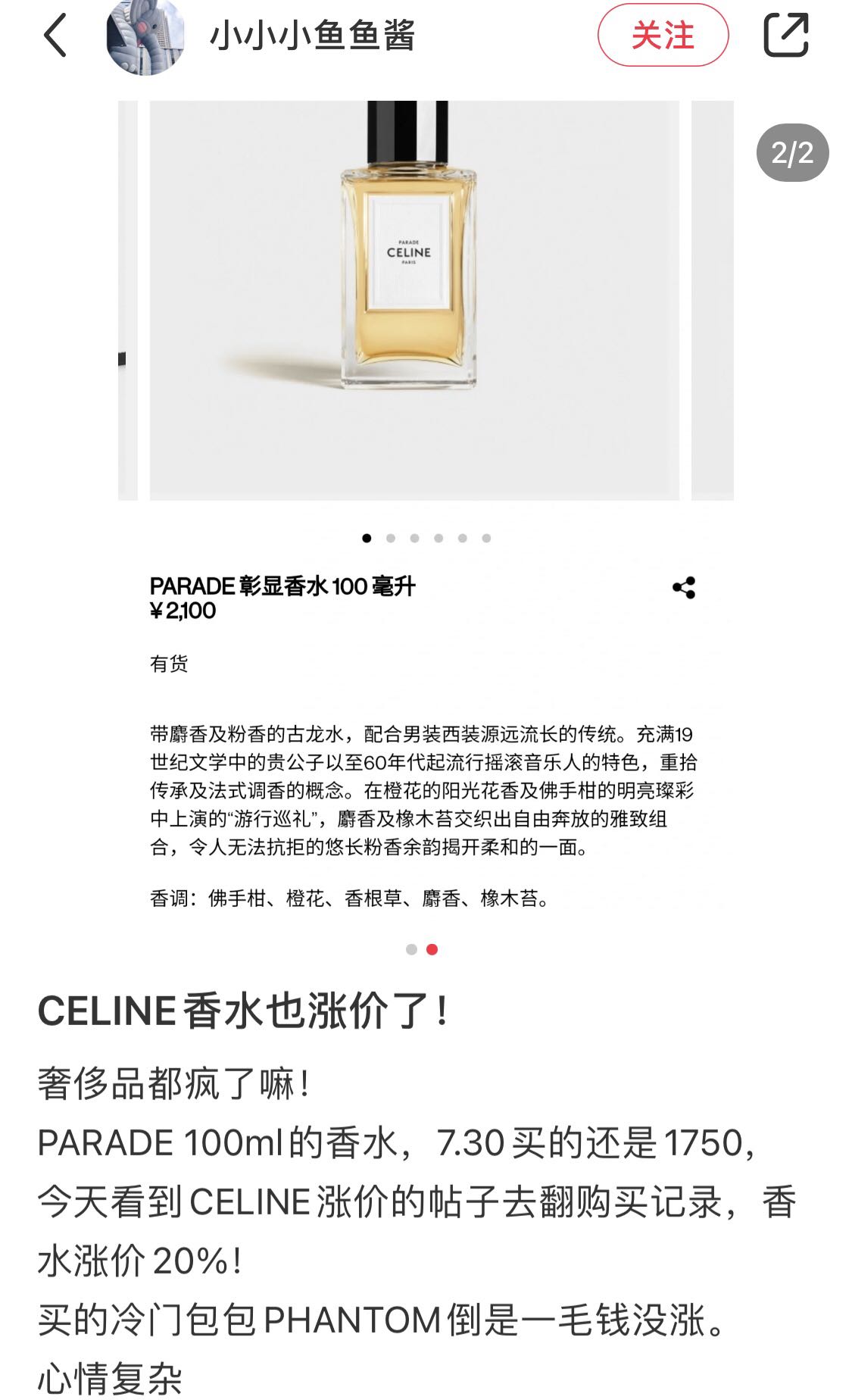 界面时尚在小红书上发现,不少消费者也在反映香水产品的价格在过去一年不断增长,其中不乏思琳CELINE、香奈儿CHANEL、路易威登Louis Vuitton、迪奥Dior等上千元的奢侈品牌香水,以及BYREDO、Diptyque等小众品牌。