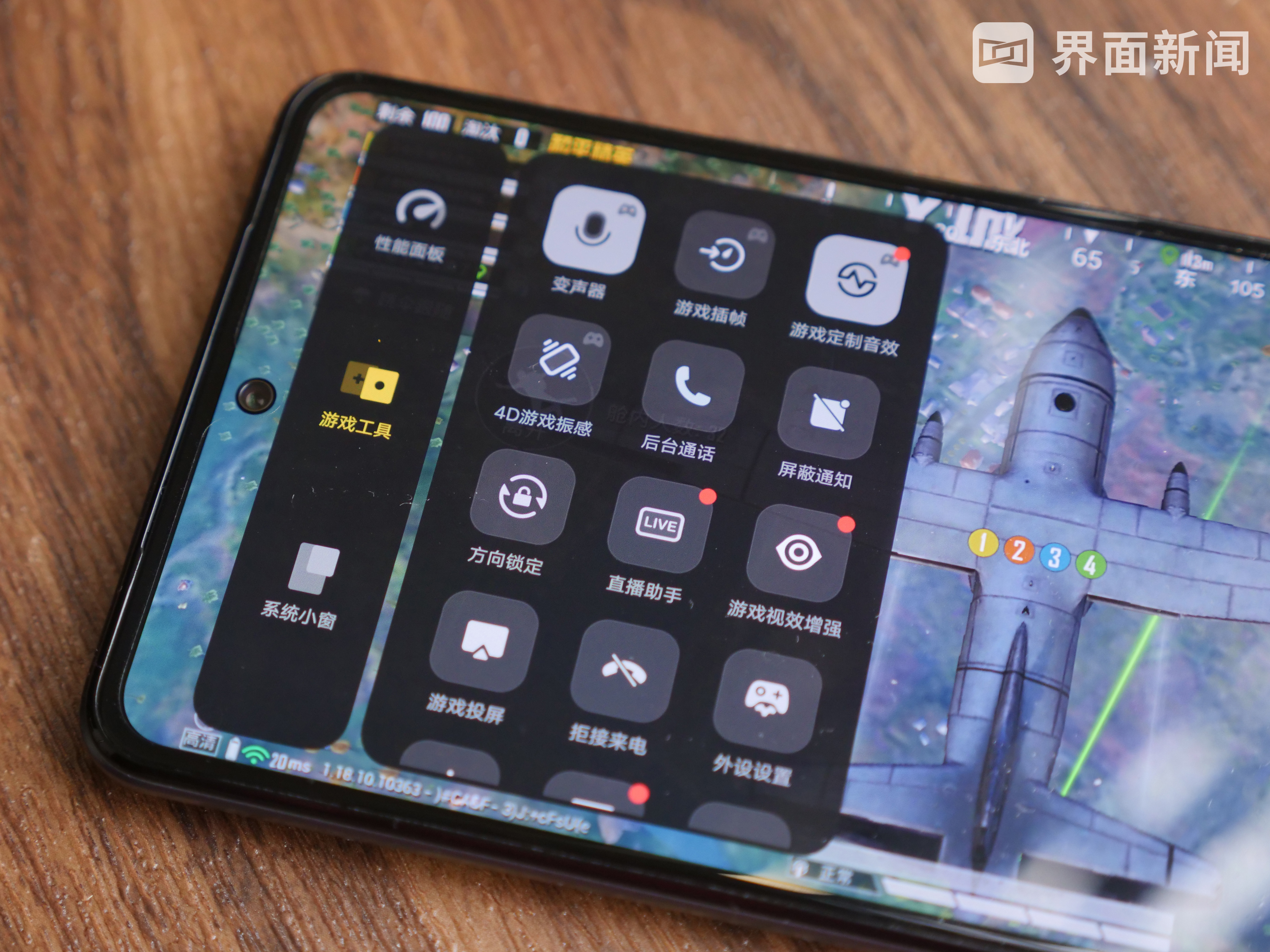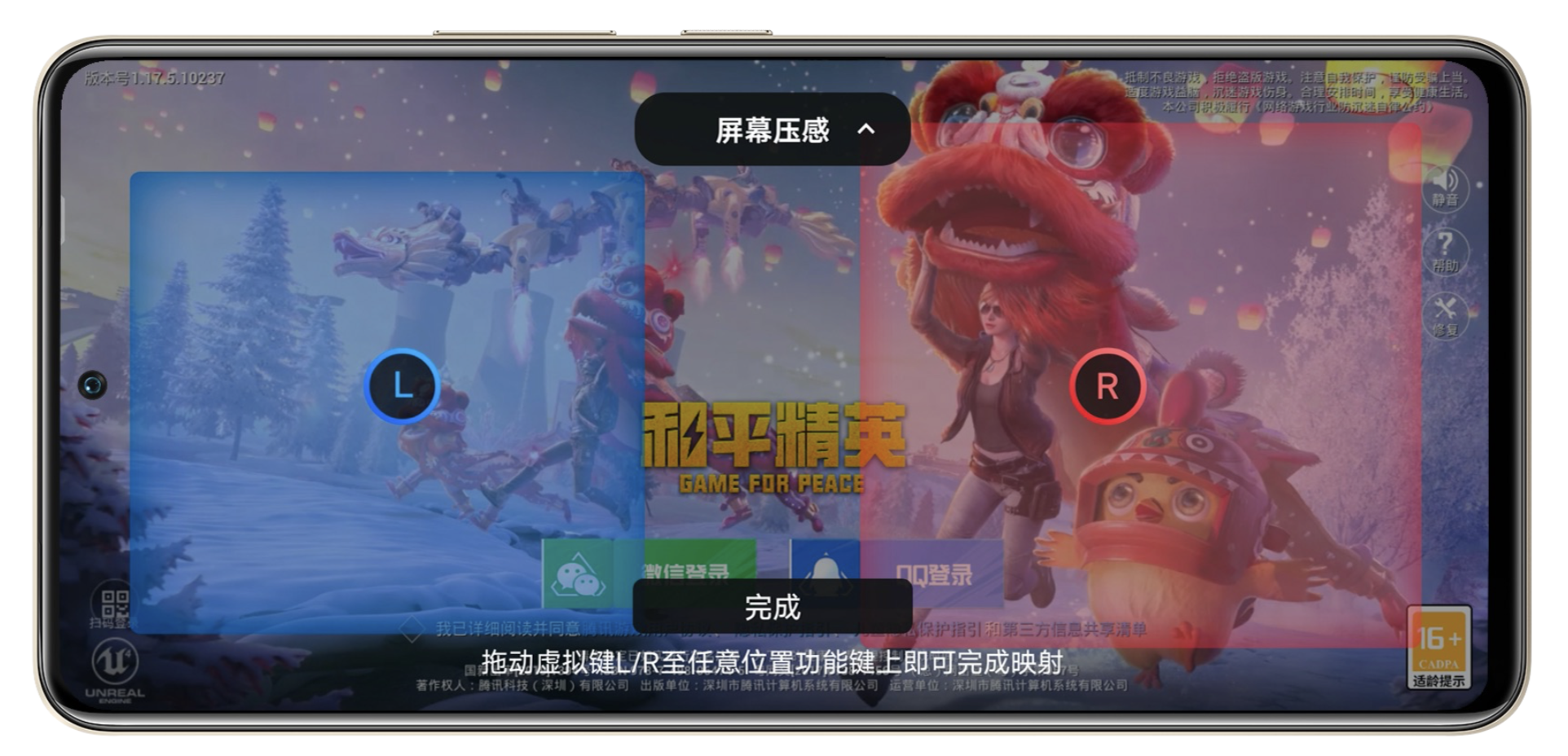 此外,新机也提供了“双控压感”功能,通过物理映射的方式,为玩家提供额外的两指操作。比如在《和平精英》内,就可以将“开镜”设置为左侧压感,那么在游戏内只要按压屏幕的左边区域,就可以调出已设置的操作。