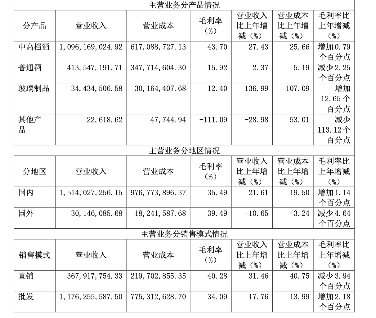 按各档位产品划分,去年古越龙山中高档酒、普通就分别实现营业收入10.96亿元、4.14亿元,同比提升27.43%、2.37%;毛利率分别为43.7%、15.92%,同比增加0.79个百分点、减少2.25个百分点;销量分别为4.95万千升、7.16万千升,同比提升12.37%、3.46%。