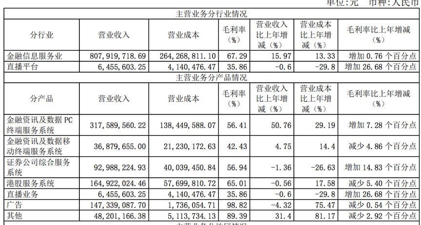 分产品来看,大智慧金融资讯及数据PC终端服务系统营收3.18亿元,同比增长50.76%;金融资讯及数据移动终端服务系统营收3687.97万元,同比增长4.75%;证券公司综合服务系统营收9298.82万元,同比减少1.36%;港股服务系统营收1.65亿元,同比减少0.56%;直播业务营收645.56万元,同比减少0.6%;广告营收1.47亿元,同比减少4.32%。