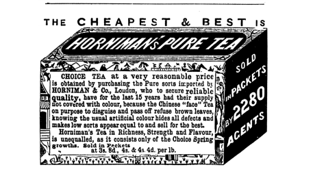 有趣的是,英国人对中国茶掺假的担忧推动了包装食品和品牌的发明。贵格会商人约翰·霍尼曼(John Hornman)被誉为包装、品牌化和宣传纯正无掺假茶叶的第一人。他从19世纪20年代就开始包装茶叶,但直到19世纪四五十年代才开始认真宣传。在一则1863年刊登的广告中,霍尼曼牌茶叶的外包装图片告诉读者,霍尼曼在“过去15年中”都在以非常合理的价格出售尚未被中国人“上过色的”纯正茶叶,它因此是“最便宜”且“最好”的茶叶。