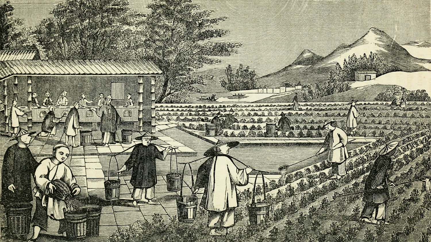 茶叶是东南亚季风区的特产,中国人种茶和饮茶的历史源远流长。西汉时期(公元前202-公元8年),中国人首次把茶叶当作草药和饮料。唐代(618-907年),陆羽《茶经》标志着茶文化已趋于成熟。不过,唐人的饮茶习惯与今人有极大的不同,当时的人们用未经发酵的茶叶加上一种黏合剂,经过蒸煮制成茶饼,使茶叶便于储存和交易。在元代(1271-1368年)和明代(1368-1644年),茶叶的现代加工方式出现了——新鲜摘取的茶叶用锅炒制、辗制并做脱水处理后,不会立即氧化,这种做法生产出的就是如今我们熟知的绿茶。从明代开始,散茶取代了团茶和茶粉,成为茶叶加工、消费和饮用的主要形式。16世纪,红茶开始流行——这是一种在烘焙前发酵,茶汤呈红色的茶叶种类。红茶中的小种茶(souchong)、工夫茶(congou)和武夷红茶(bohea)不仅是如今中国人依然爱喝的红茶,且远销海外。18世纪,中国至少有12个省份种植了茶叶。