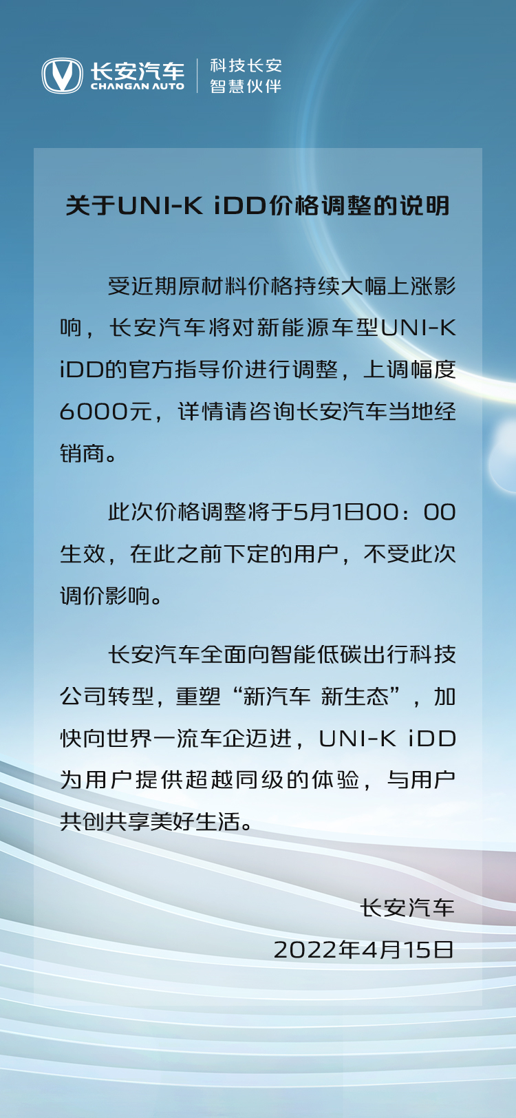 4月15日午间,长安汽车官微发布关于UNI-K iDD价格调整的说明:受近期原材料价格持续大幅上涨影响,长安汽车将对新能源车型UNI-K iDD的官方指导价进行调整,上调幅度6000元。此次价格调整将于5月1日00:00生效,在此之前下定的用户,不受此次调价影响。