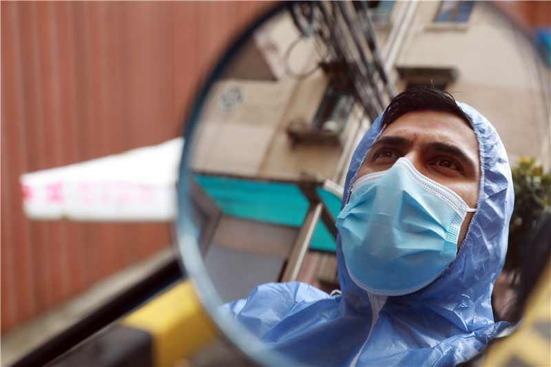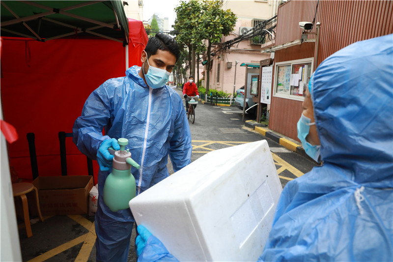 4月15日,在上海市徐汇区枫林新村小区,尼泊尔志愿者Shankar Koirala在志愿服务中。(中国日报记者 朱兴鑫 摄)