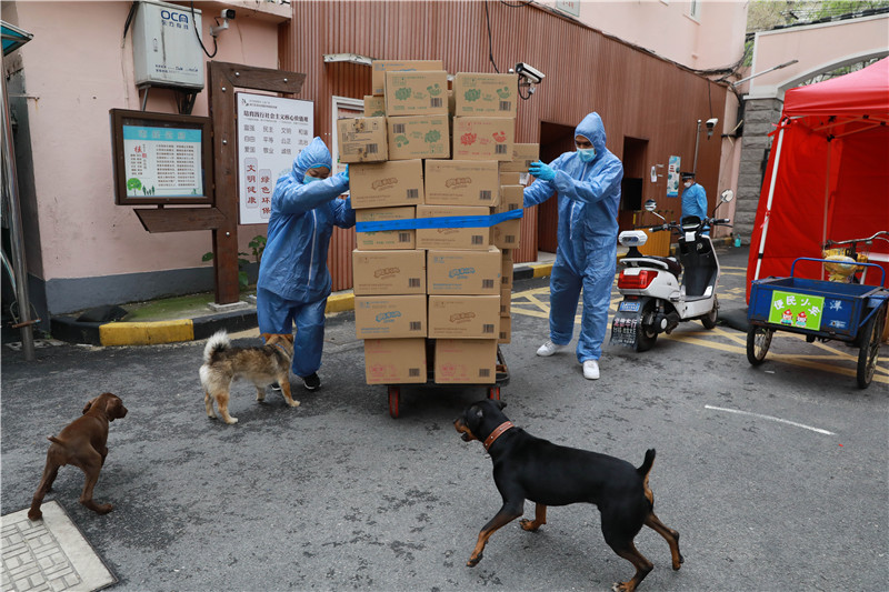 4月15日,在上海市徐汇区枫林新村小区,尼泊尔志愿者Shankar Koirala(右)帮助居民运送物资。(中国日报记者 朱兴鑫 摄)