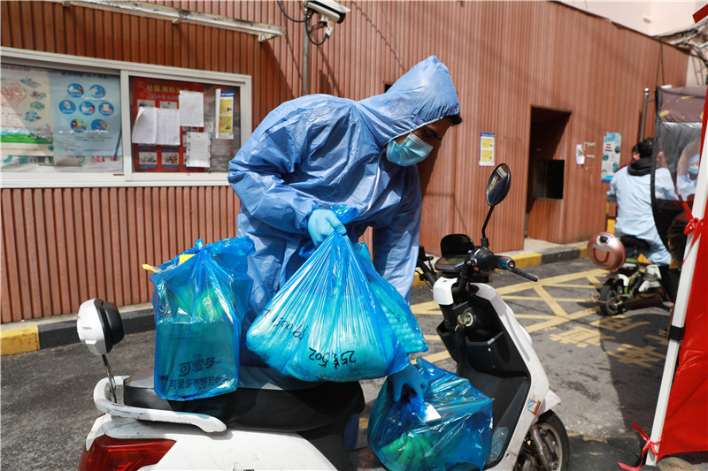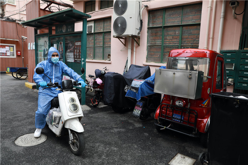 4月15日,在上海市徐汇区枫林新村小区,尼泊尔志愿者Shankar Koirala骑着电动车为居民送物资。(中国日报记者 朱兴鑫 摄)