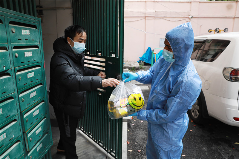 4月15日,在上海市徐汇区枫林新村小区,尼泊尔志愿者Shankar Koirala为居民送快递。(中国日报记者 朱兴鑫 摄)