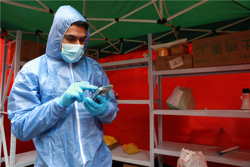 4月15日,在上海市徐汇区枫林新村小区,尼泊尔志愿者Shankar Koirala查看手机信息。(中国日报记者 朱兴鑫 摄)